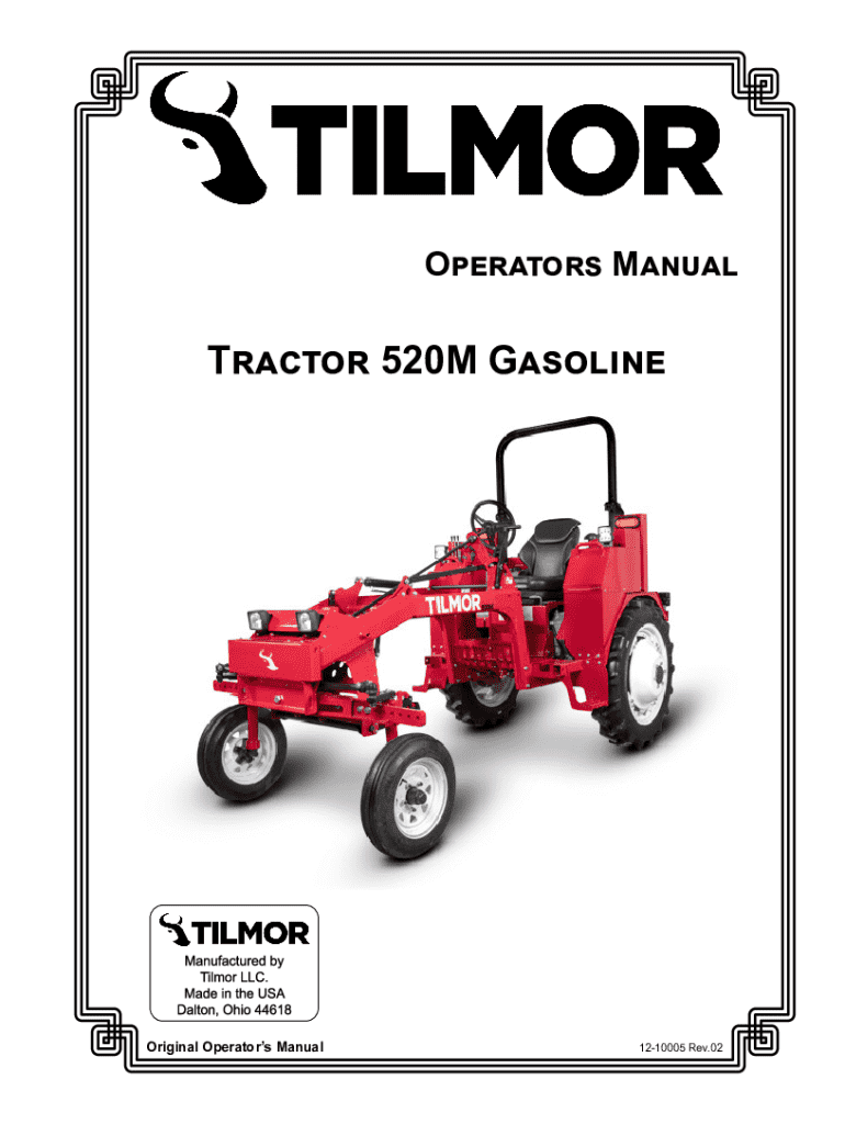 This is the original operator\'s manual for the Tilmor 520M tractor, which provides essential information on safe operation, maintenance, and service of the tractor. It includes details on safety, operational controls, general operation, service procedures, specifications, and warranty information.