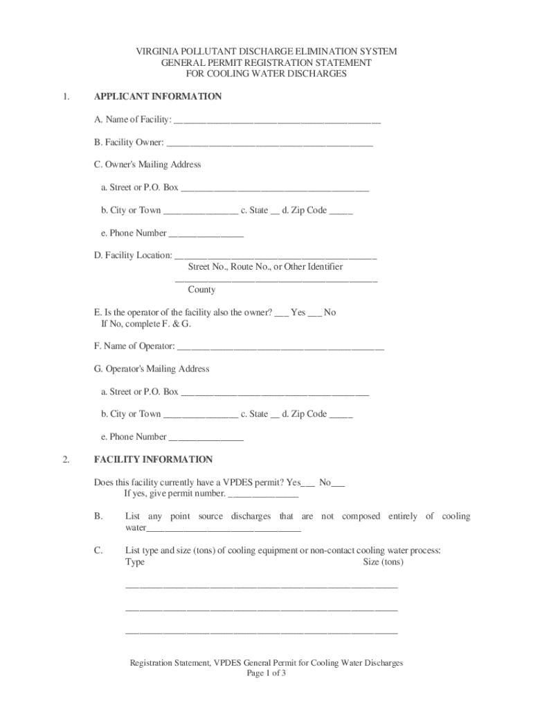 This document serves as a registration statement for obtaining a Virginia Pollutant Discharge Elimination System (VPDES) General Permit for cooling water discharges. It includes sections for applicant information, facility details, discharge information, and required attachments for compliance with environmental regulations.