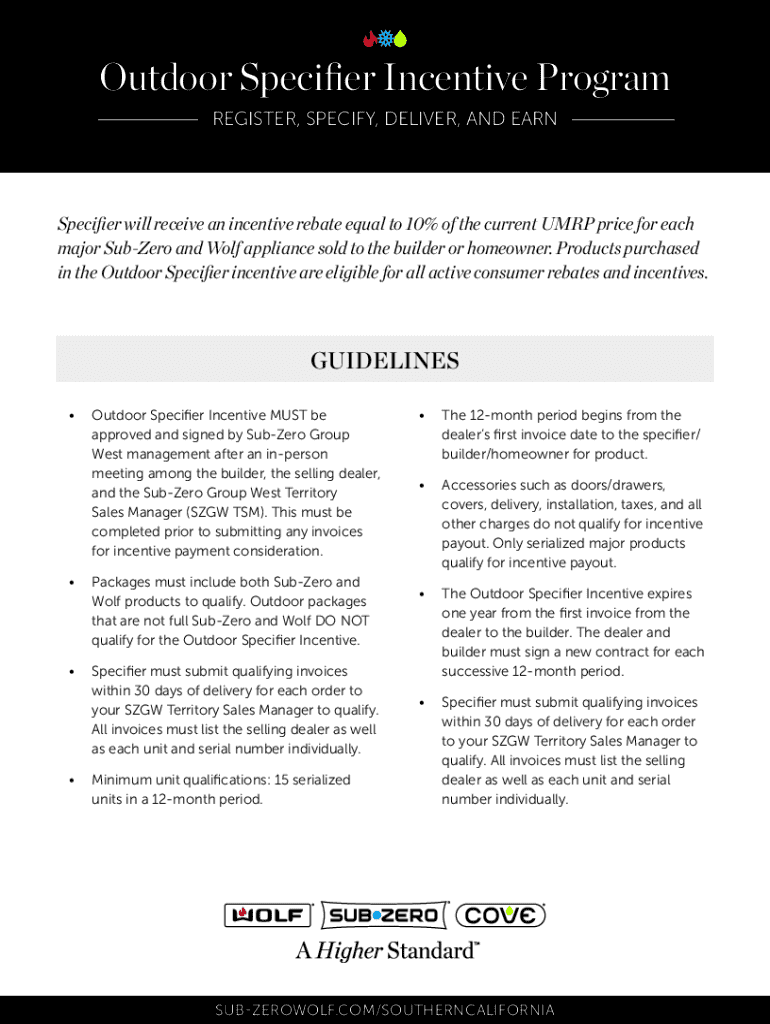 Outdoor Specifier Incentive Program REGISTER, SPECIFY, DELIVER, AND EARNSpecifier will receive an incentive rebate equal to 10% of the current UMRP price for each major SubZero and Wolf appliance