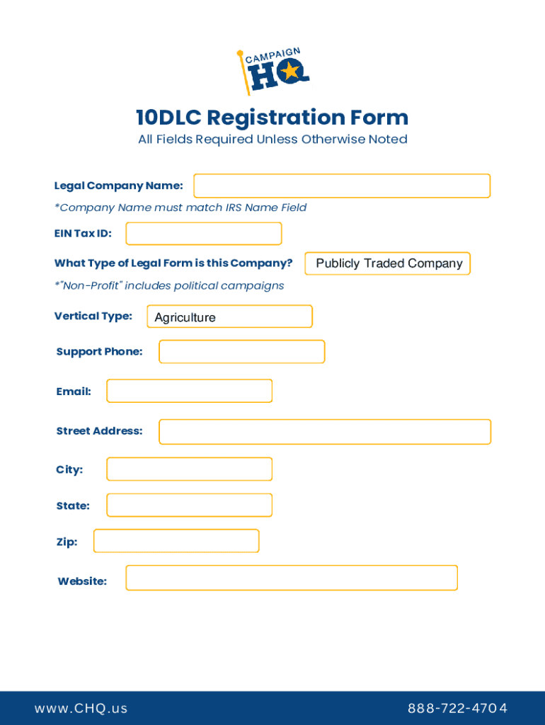 10DLC RegistrationAfter we receive the necessary information, CHQ will get your organization registered.What is 10DLC Registration? A 10Digit Long Code (10DLC) is issued by U.S. cell phone carriers