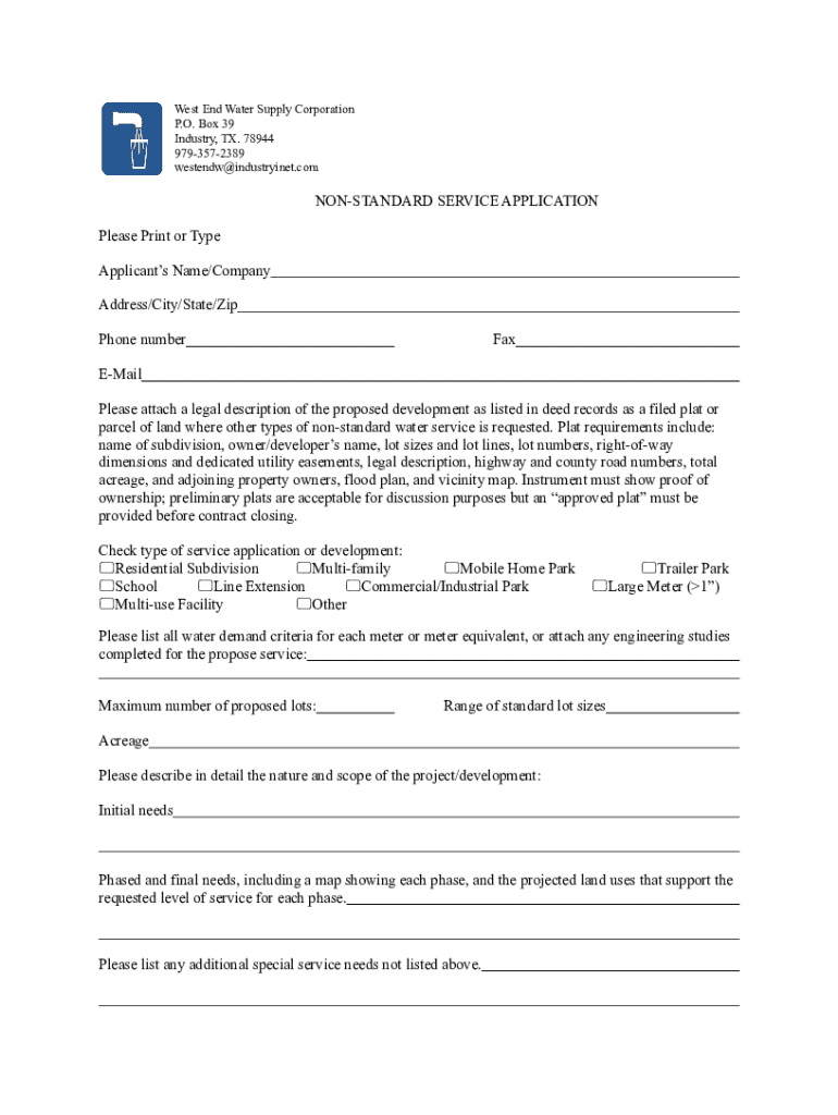 This document serves as an application for non-standard water service from the West End Water Supply Corporation. It requires details about the applicant, a description of the proposed development, and a legal description of the property. The application outlines the specific service requested, outlines the required fees, and provides a timeline along with additional requirements for processing the request.