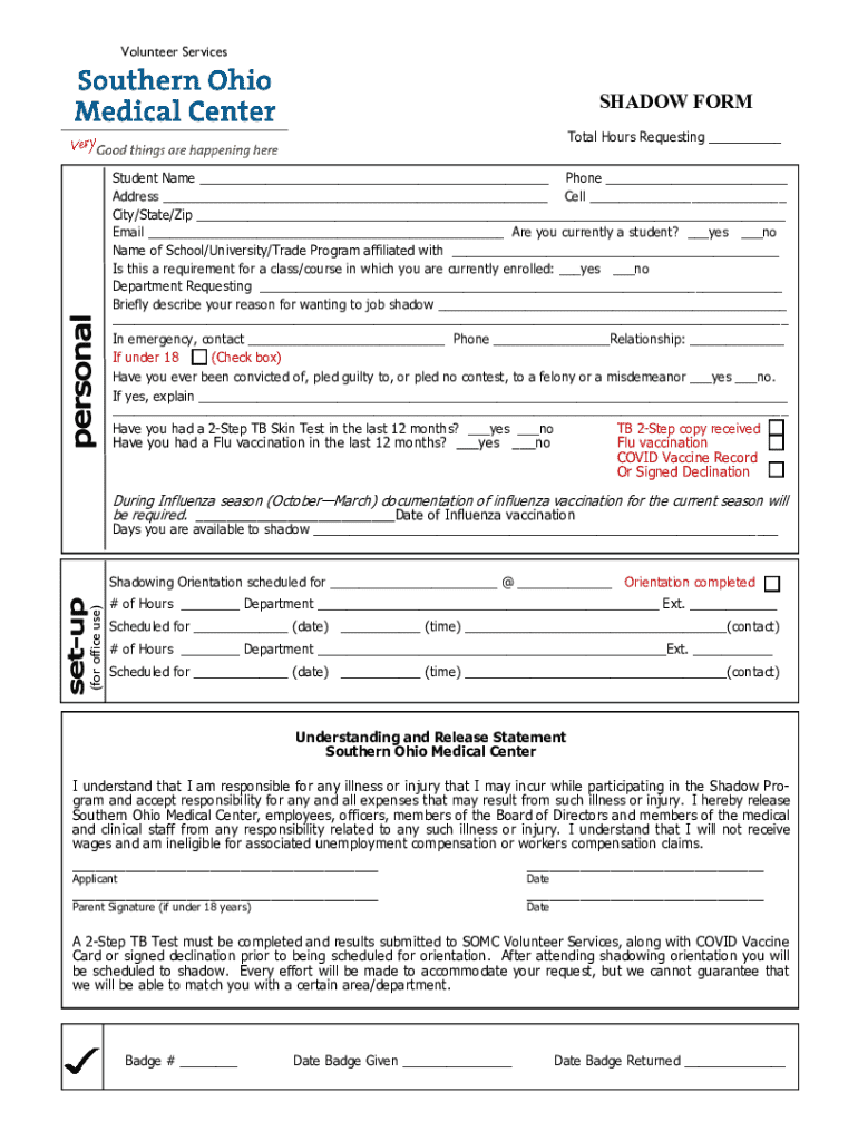 This form is intended for applicants who wish to participate in the shadow program at Southern Ohio Medical Center. It collects essential information regarding the applicant\'s background, availability, and health requirements, as well as providing a legal release regarding liability for any illnesses or injuries incurred during the program.