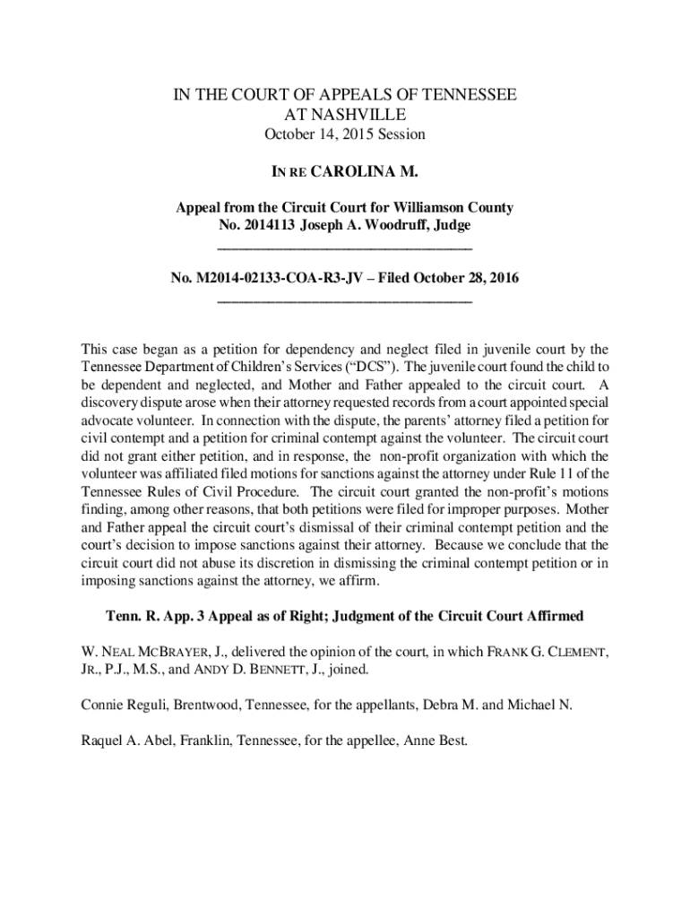 This document pertains to a legal case involving a petition for dependency and neglect filed by the Tennessee Department of Children\'s Services. The case discusses the appeal made by the parents regarding the juvenile court\'s findings and subsequent contempt petitions filed by their attorney against a volunteer from CASA. The circuit court\'s decisions regarding contempt petitions and sanctions imposed under Rule 11 of the Tennessee Rules of Civil Procedure are also analyzed and upheld.