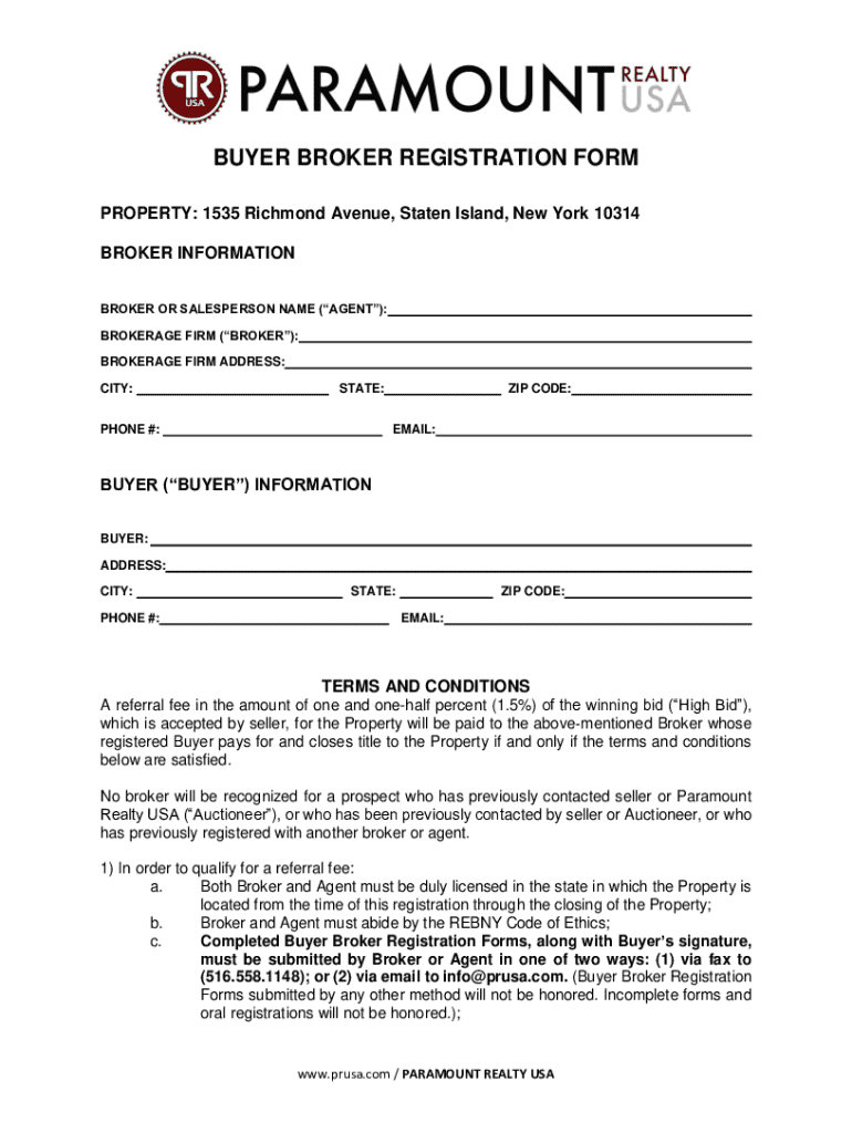 This document outlines the terms and conditions for registering a buyer with a broker for the property located at 1535 Richmond Avenue, Staten Island, NY. It includes essential information required from both the broker and the buyer, and details the referral fee structure connected to successful transactions.