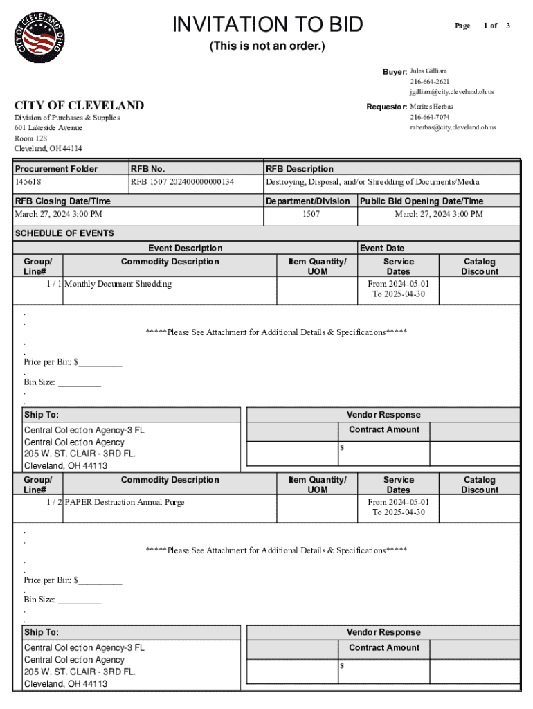 INVITATION TO BIDPage1 of(This is not an order.) Buyer: Jules Gilliam 2166642621 jgilliam@city.cleveland.oh.usCITY OF CLEVELANDRequestor: Marites Herbas 2166647074 mherbas@city.cleveland.oh.usDivision