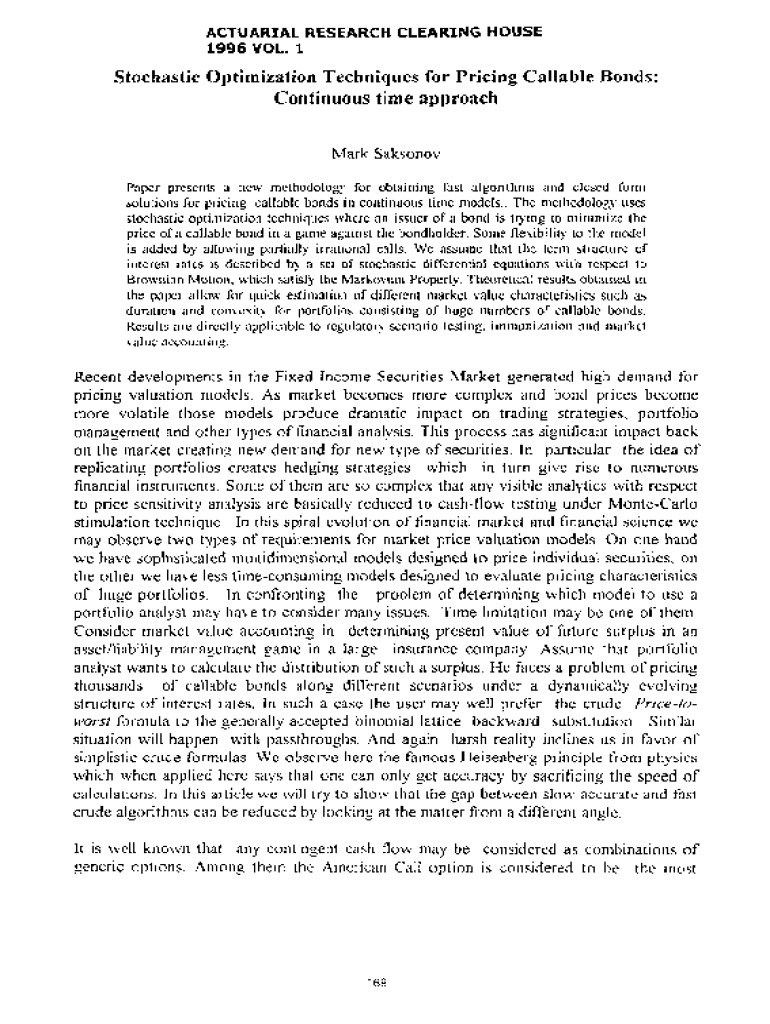 A C T U A R I A L RESEARCH C L E A R I N G HOUSE 1.996 VOL.Stochastic Optimization Techniques for Pricing Callable Bonds: Continuous time approachMark Saksonov Paper presents a new methodnlogy for