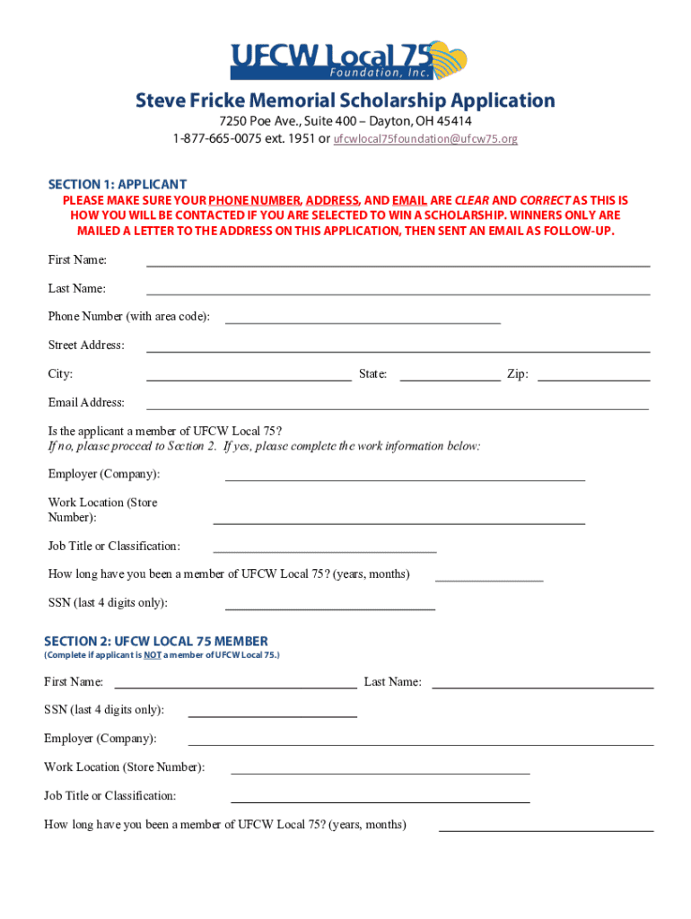 This application form is for the Steve Fricke Memorial Scholarship offered by UFCW Local 75. It includes sections for personal information, membership status, education details, activities and awards, work history, and an essay component. The application must be submitted by June 30, 2024, and requires an official transcript to be included.