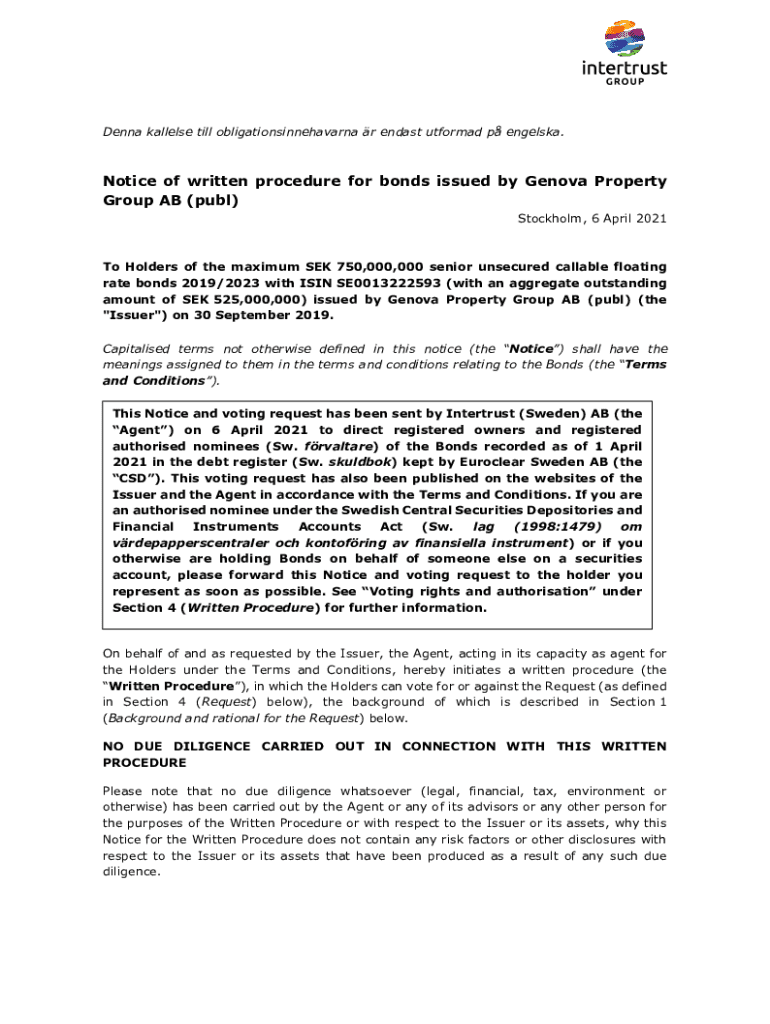 Denna kallelse till obligationsinnehavarna r endast utformad p engelska.Notice of written procedure for bonds issued by Genova Property Group AB (publ) Stockholm, 6 April 2021To Holders of the maximum