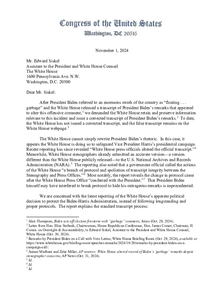 November 1, 2024 Mr. Edward Siskel Assistant to the President and White House Counsel The White House 1600 Pennsylvania Ave. N.W. Washington, D.C. 20500 Dear Mr. Siskel: After President Biden referred
