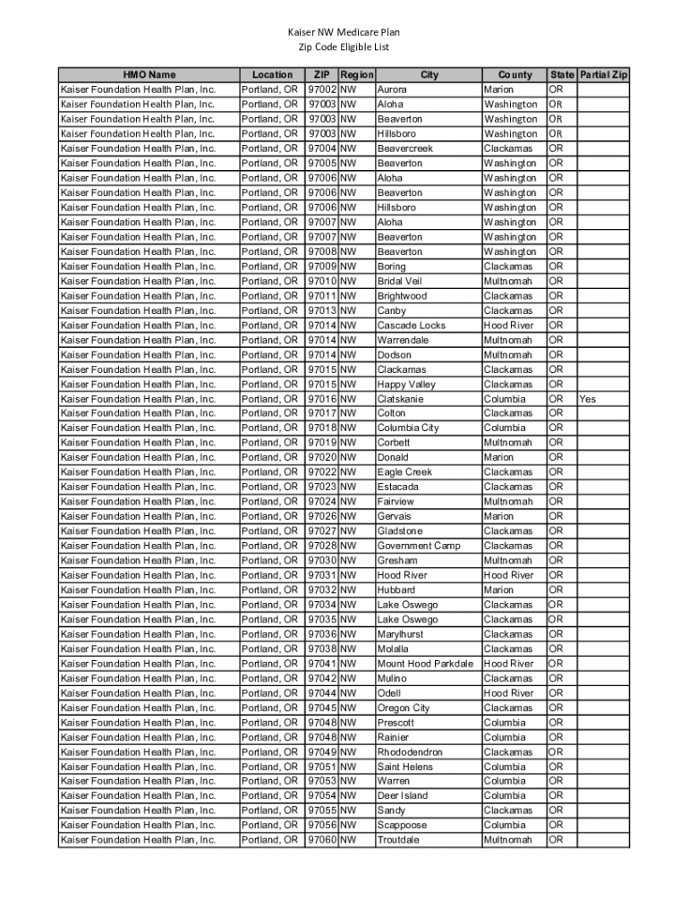 This document provides a comprehensive list of zip codes that are eligible for the Kaiser NW Medicare Plan, detailing the areas covered under the Kaiser Foundation Health Plan, Inc. It includes specific regions within Oregon and Washington, particularly focused on cities surrounding Portland, OR.