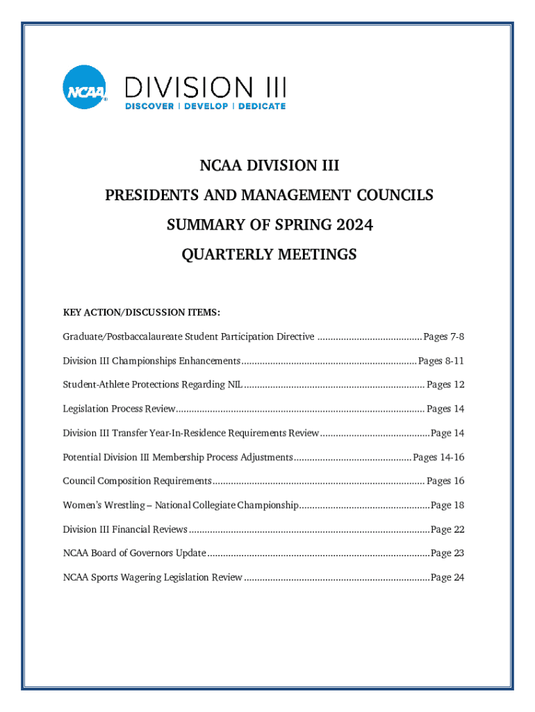 This document summarizes the key actions and discussion items from the NCAA Division III Presidents and Management Councils meetings held via videoconference in April 2024. The summary includes important directives such as graduate student participation, enhancements to championships, student-athlete protections regarding name, image, and likeness, and updates on various legislative processes and requirements. It also features attendance records and procedural updates relevant to Division III...