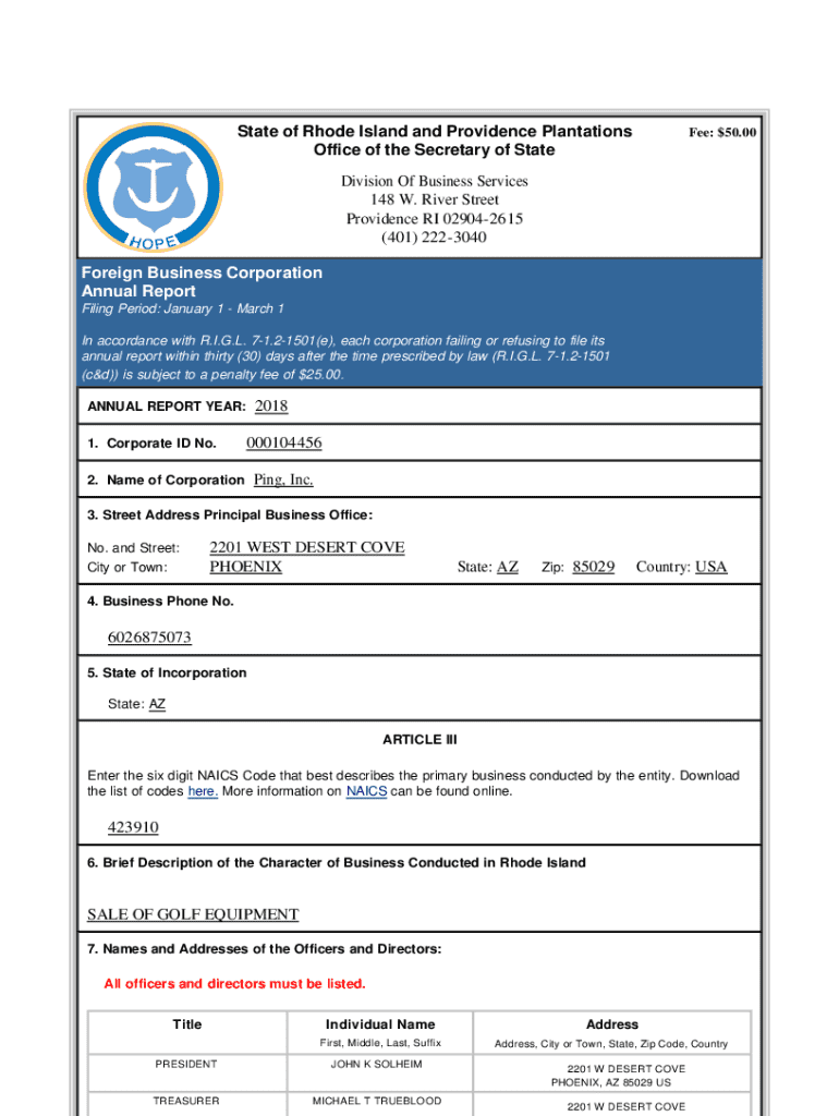 This document is an annual report for Ping, Inc., a foreign business corporation registered in Rhode Island and provides essential corporate information, including officer names, business description, and compliance with filing requirements.