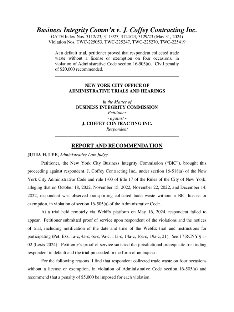 This document contains a report and recommendation regarding the violations committed by J. Coffey Contracting Inc. for collecting trade waste without the necessary license from the New York City Business Integrity Commission (BIC). The respondent was found guilty of multiple violations occurring on four separate occasions and a civil penalty of $20,000 has been recommended.
