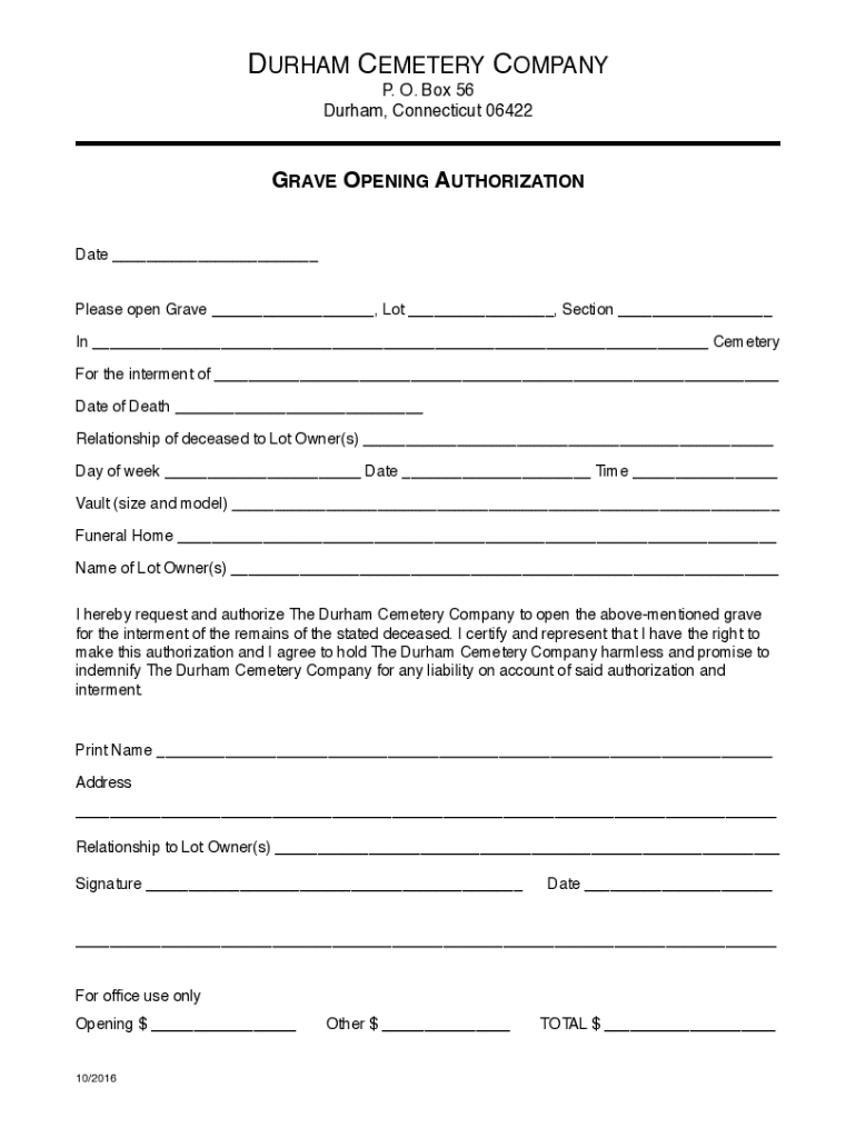 How to fill out grave opening authorization