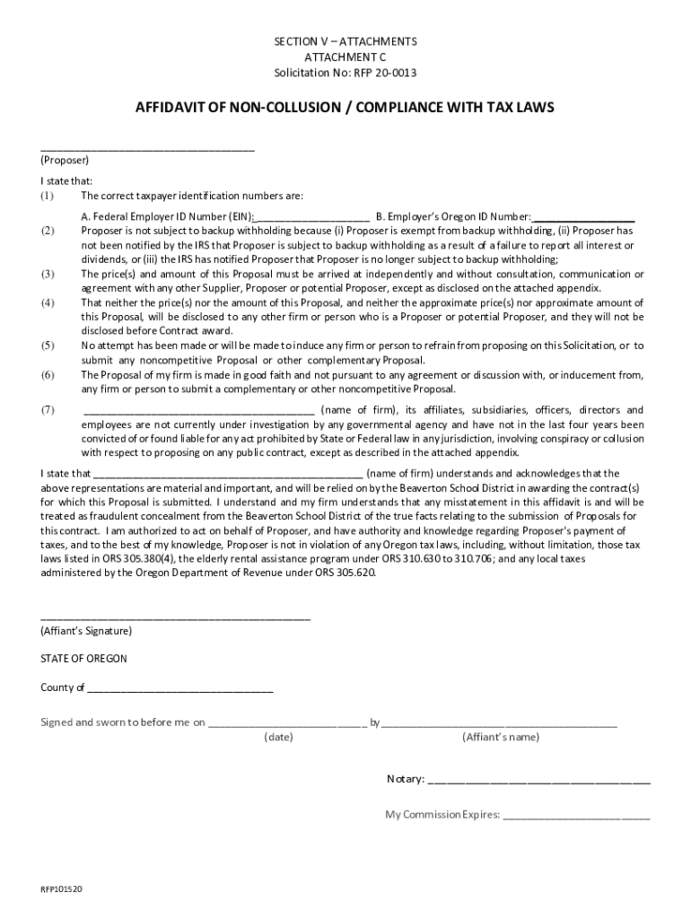 This document serves as an affidavit to confirm the non-collusion of the proposer in relation to the submission of proposals for the Beaverton School District\'s RFP 20-0013, as well as compliance with applicable tax laws. It requires the proposer to disclose taxpayer identification numbers and affirm the independence of their proposal.