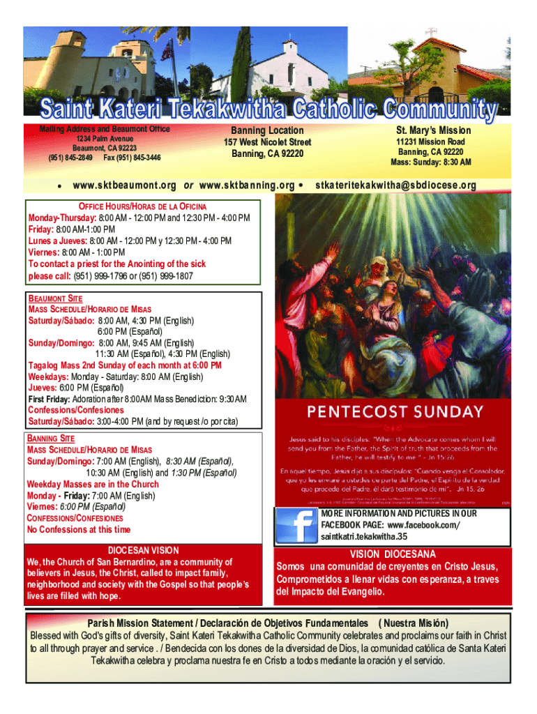 This document serves as the community newsletter for St. Kateri Tekakwitha Catholic Community, providing information on mass schedules, office hours, upcoming events, community activities, and essential parish announcements.