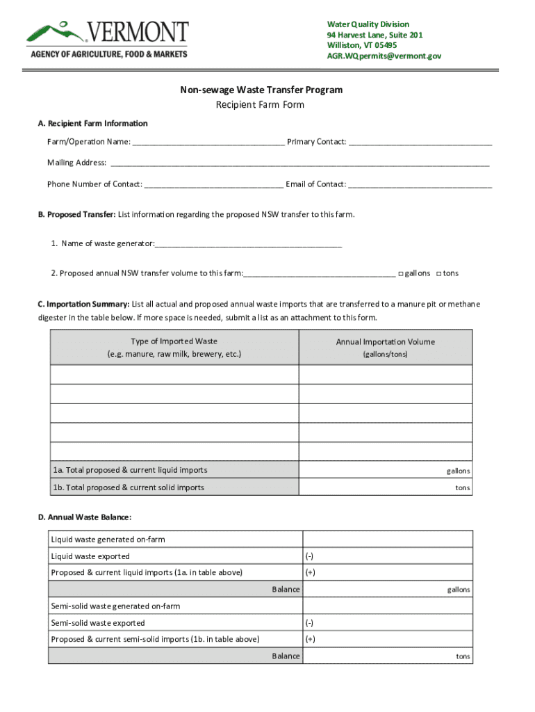 This form is intended for farms participating in the Non-sewage Waste Transfer Program, providing necessary information regarding waste imports, storage capacity, and nutrient management practices to comply with Vermont’s agricultural waste regulations.