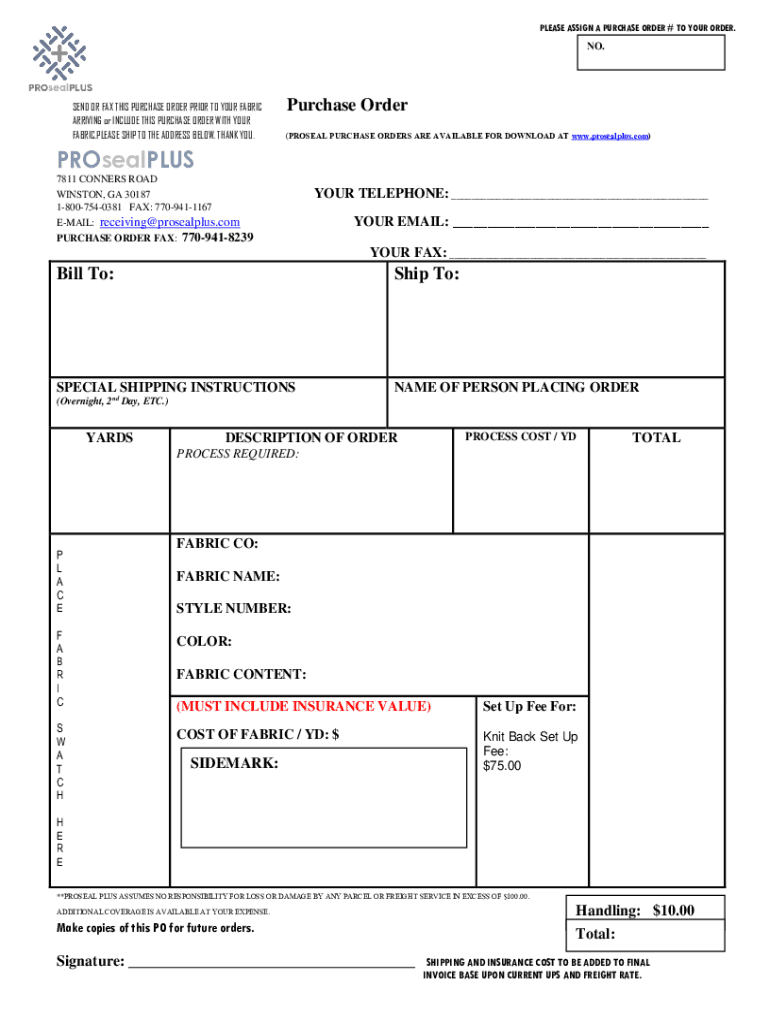 This purchase order form is required for placing orders with ProSeal Plus for fabric processing. It includes necessary details such as shipping instructions, costs, and terms and conditions related to the order. Users must fill in their contact information and specific order details to facilitate the processing of fabrics.