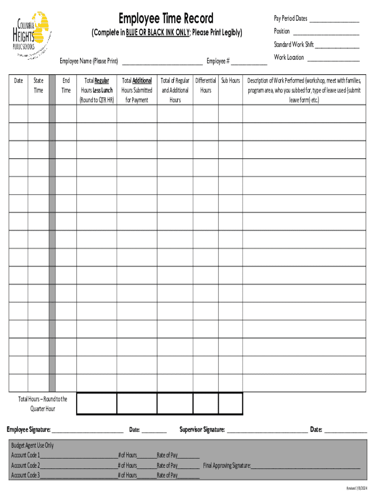 Employee Time RecordPay Period Dates ___(Complete in BLUE OR BLACK INK ONLY; Please Print Legibly)Position ___ Standard Work Shift ___Employee Name (Please Print) ___ Employee # ___ DateState TimeEnd
