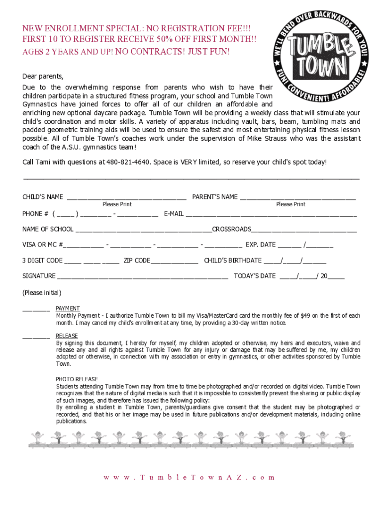 NEW ENROLLMENT SPECIAL: NO REGISTRATION FEE!!! FIRST 10 TO REGISTER RECEIVE 50% OFF FIRST MONTH!! AGES 2 YEARS AND UP! NO CONTRACTS! JUST FUN! Dear parents, Due to the overwhelming response from parents