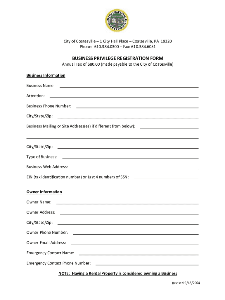 This form is used to register a business with the City of Coatesville for the annual business privilege tax. It requires information regarding the business owner, business details, and contact information.