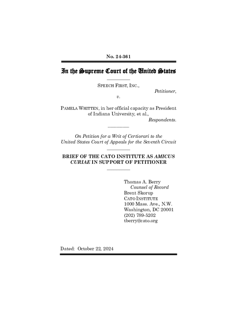 This document is an amicus brief submitted by the Cato Institute to the Supreme Court of the United States in the case of Speech First, Inc. vs. Pamela Whitten and others. The brief argues against bias-response teams at universities, asserting they chill free speech and violate the First Amendment rights of students. It discusses the implications of such policies, the legal precedents involved, and the need for the Court to address these issues to protect academic freedom and free expression...