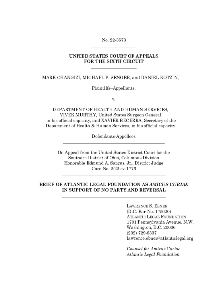This document is a brief submitted by the Atlantic Legal Foundation as amicus curiae in support of reversal in the case of Changizi v. Department of Health and Human Services. It discusses the implications of the federal government\'s perceived censorship of free speech related to COVID-19 mitigation policies and the importance of upholding First Amendment rights during a public health crisis. The brief argues against the government\'s actions that suppress criticism of its COVID-19 policies,...
