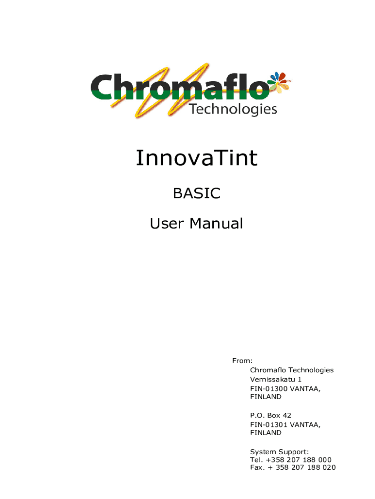 The user manual for the InnovaTint Basic software, detailing features such as starting and closing the program, software activation and deactivation, order management, colorant levels, tools and settings, and a comprehensive guide for creating and managing color formulas. It also includes information on usage, troubleshooting, and technical support.