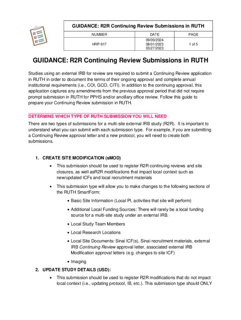 GUIDANCE: R2R Continuing Review Submissions in RUTH NUMBER HRP917DATE 09/09/2024 08/01/2023 03/27/2023PAGE 1 of 5GUIDANCE: R2R Continuing Review Submissions in RUTH Studies using an external IRB for