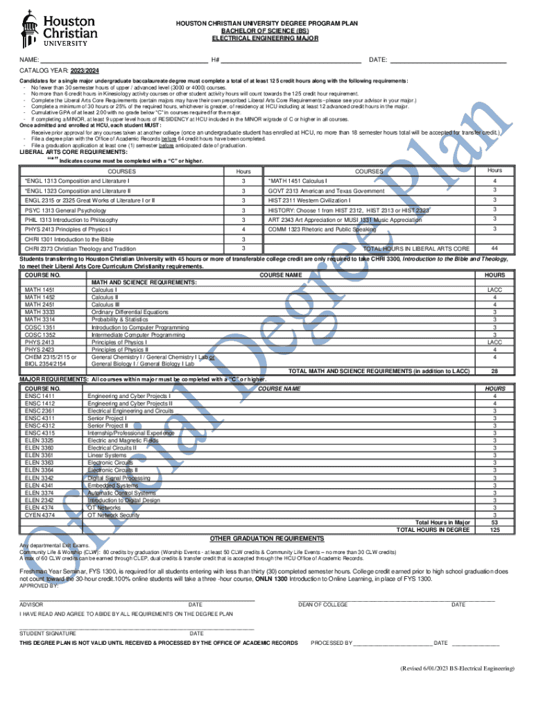 HOUSTON CHRISTIAN UNIVERSITY DEGREE PROGRAM PLAN BACHELOR OF SCIENCE (BS) ELECTRICAL ENGINEERING MAJORNAME:H#DATE:CATALOG YEAR: 2023/2024 Candidates for a single major undergraduate baccalaureate