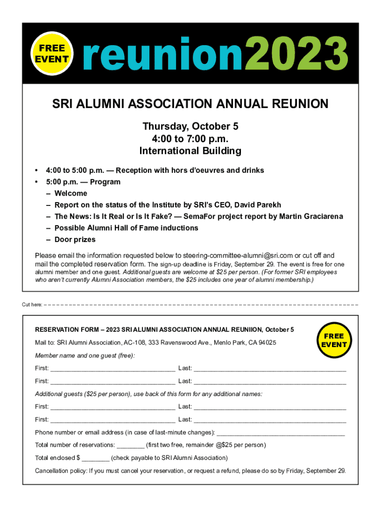 FREE EVENTreunion2023SRI ALUMNI ASSOCIATION ANNUAL REUNION Thursday, October 5 4:00 to 7:00 p.m. International Building 4:00 to 5:00 p.m. Reception with hors doeuvres and drinks 5:00 p.m. Program