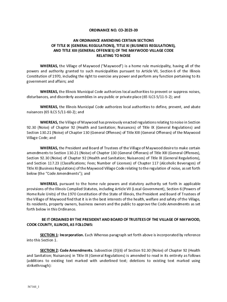 ORDINANCE NO. CO202339 AN ORDINANCE AMENDING CERTAIN SECTIONS OF TITLE IX (GENERAL REGULATIONS), TITLE XI (BUSINESS REGULATIONS), AND TITLE XIII (GENERAL OFFENSES) OF THE MAYWOOD VILLAGE CODE RELATING