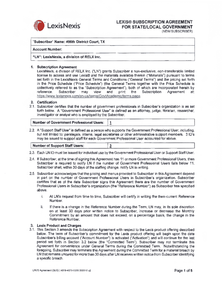 LEXIS SUBSCRIPTION AGREEMENT FORSTAT8LOCALGOVERNMENT. LexisNexis(NEW SUBSCRIBER)\"Subscriber\" Name: 456th District Court, TX Account Number: \"LN\": LexisNexis, a division of RELX Inc. 1.Subscription