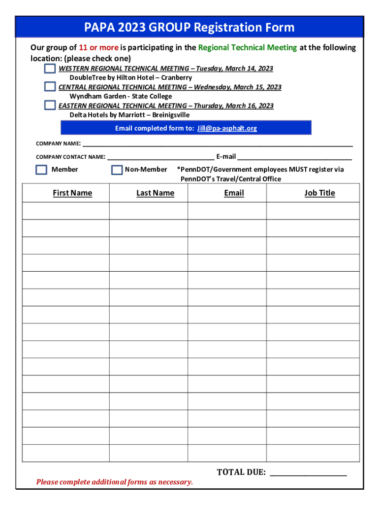 This form is intended for groups of 11 or more participants registering for the PAPA 2023 Regional Technical Meetings held across various locations in Pennsylvania. Participants need to specify their choice of meeting location, provide contact information, and submit the form via email.