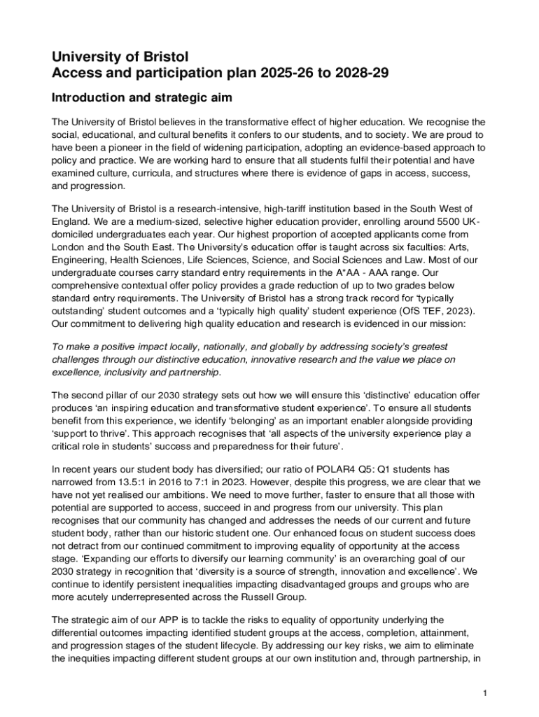 The University of Bristol\'s Access and Participation Plan outlines strategies to enhance access, success, and progression for students from a range of underserved backgrounds, including those from lower socioeconomic groups, Black and Asian students, and mature learners. The plan emphasizes a commitment to inclusivity and diversity, aiming to tackle existing disparities in higher education through targeted support, outreach programs, and inclusive educational practices.
