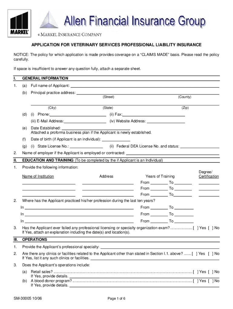 APPLICATION FOR VETERINARY SERVICES PROFESSIONAL LIABILITY INSURANCE NOTICE: The policy for which application is made provides coverage on a CLAIMS MADE basis. Please read the policy carefully. If