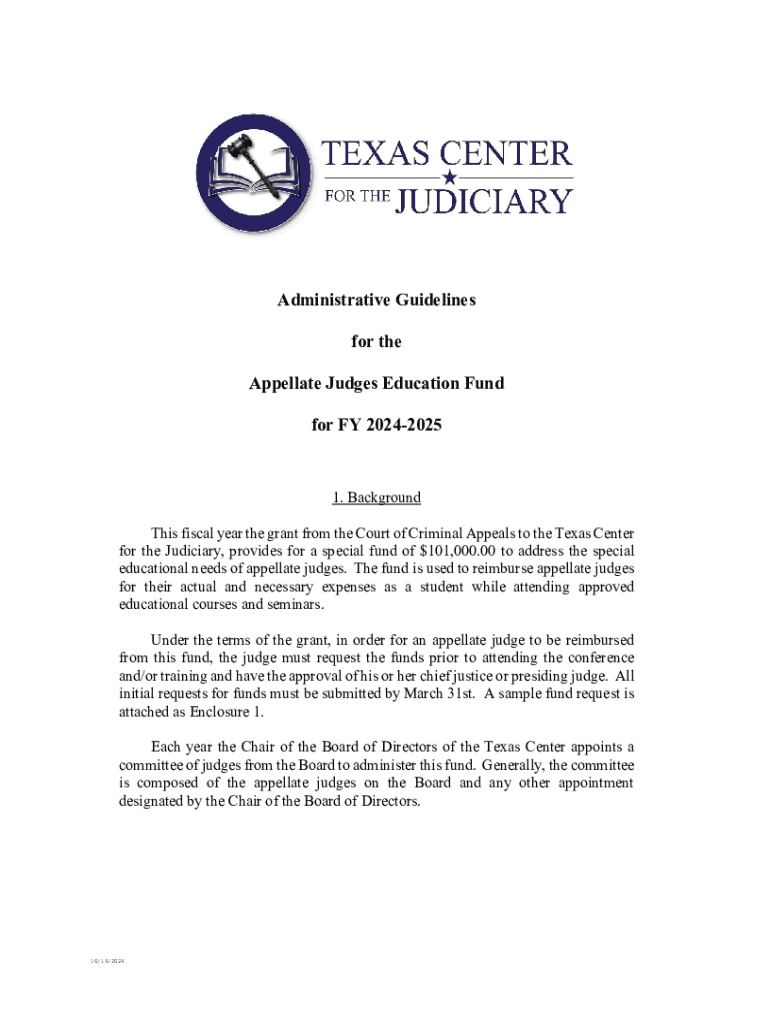 This document outlines the administrative guidelines for the Appellate Judges Education Fund for the fiscal year 2024-2025, detailing the allocation of funds, eligibility criteria for reimbursement, and processes for requesting educational funds for appellate judges in Texas.