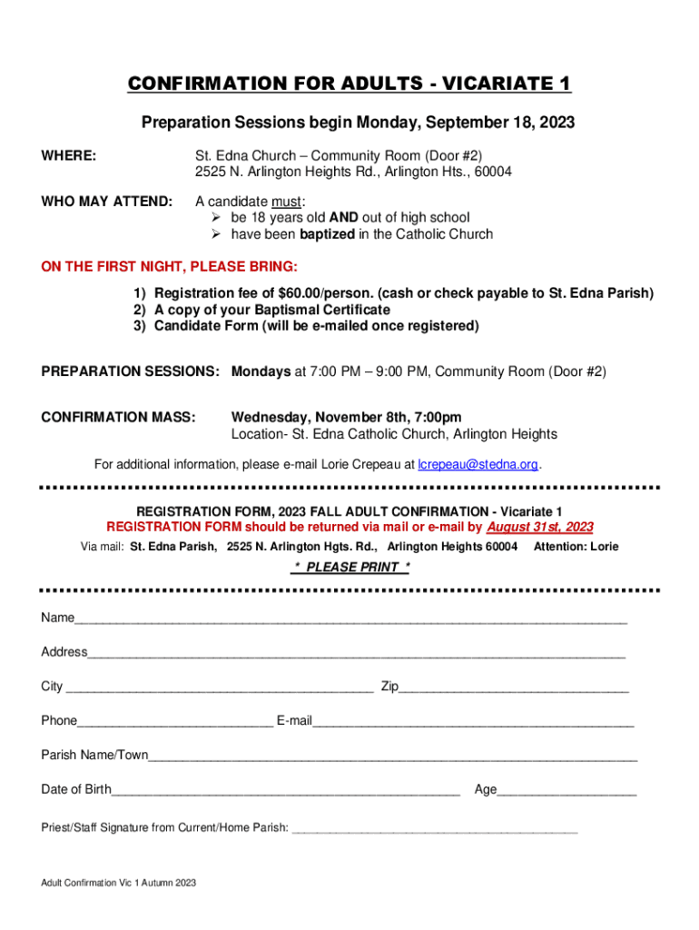 CONFIRMATION FOR ADULTS VICARIATE 1 Preparation Sessions begin Monday, September 18, 2023 WHERE:St. Edna Church Community Room (Door #2) 2525 N. Arlington Heights Rd., Arlington Hts., 60004WHO MAY