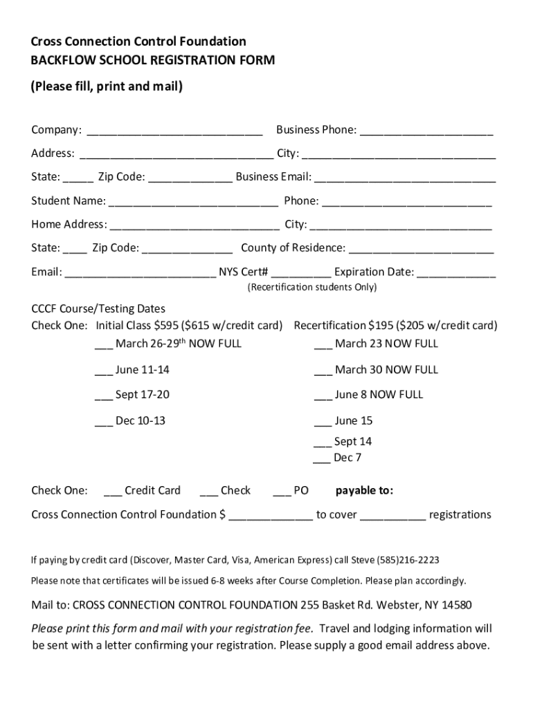 This form is used for registering students for backflow prevention courses offered by the Cross Connection Control Foundation, including initial classes and recertification options.