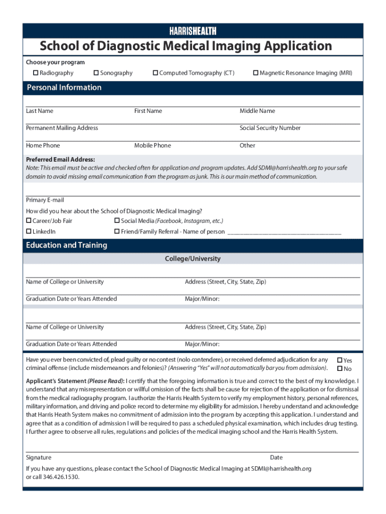 This application form is intended for prospective students seeking admission to various diagnostic medical imaging programs, including Radiography, Sonography, Computed Tomography (CT), and Magnetic Resonance Imaging (MRI). It collects personal information, educational background, and any relevant criminal history, and outlines the conditions of admission.