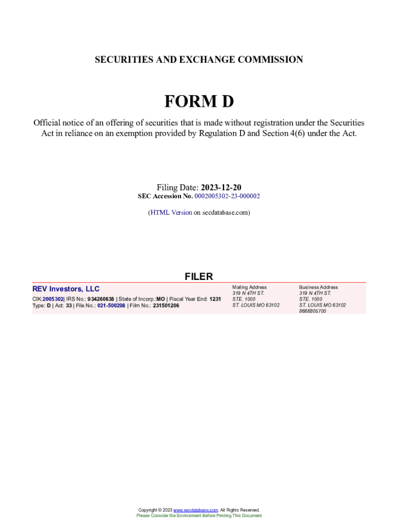 Get the free REV Investors, LLC Form D Filed 2023-12-20. Accession Number