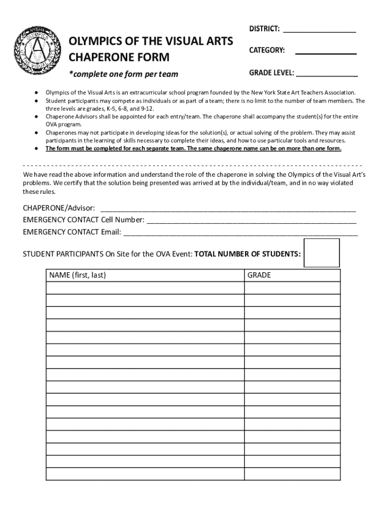 This form is to be completed for each team participating in the Olympics of the Visual Arts, an extracurricular program organized by the New York State Art Teachers Association. It outlines the role of chaperones assigned to each team and captures necessary emergency contact information and participant details.