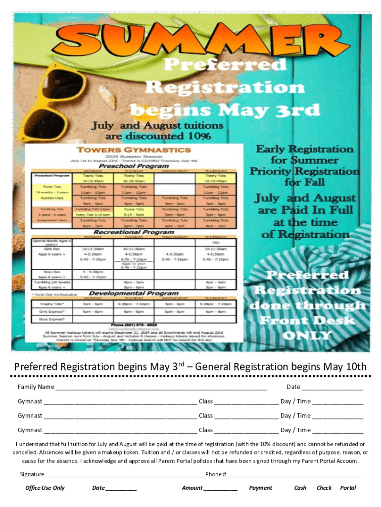 Preferred Registration begins May 3rd General Registration begins May 10th Family Name ___Date ___Gymnast ___ Class ___ Day / Time ___ Gymnast ___ Class ___ Day / Time ___ Gymnast ___ Class ___ Day