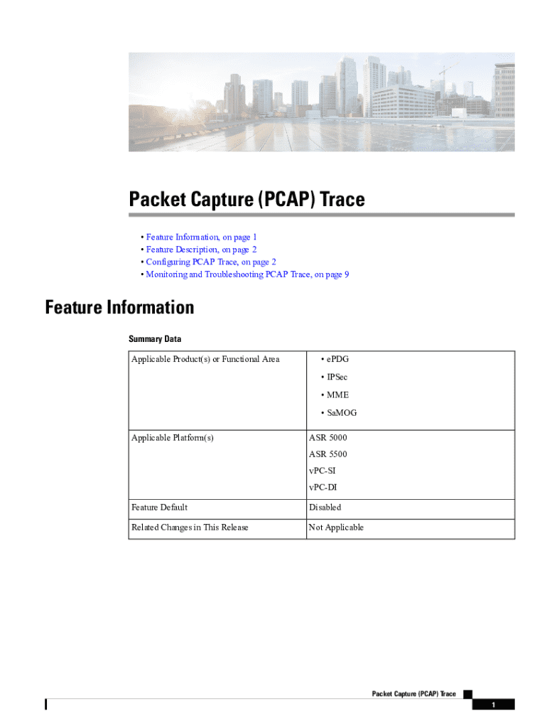 This document provides comprehensive information about the Packet Capture (PCAP) Trace feature, its configuration, monitoring and troubleshooting. It covers configurations for hexdump files, instances of CDRMOD, and features related to the ePDG, IPSec, MME, and SaMOG products across various platforms.