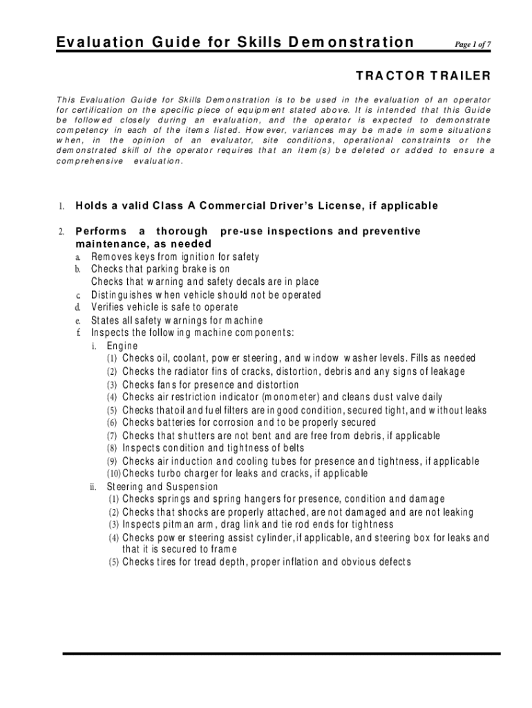 Evaluation Guide for Skills DemonstrationPage 1 of 7TRACTOR TRAILER This Evaluation Guide for Skills Demonstration is to be used in the evaluation of an operator for certification on the specific