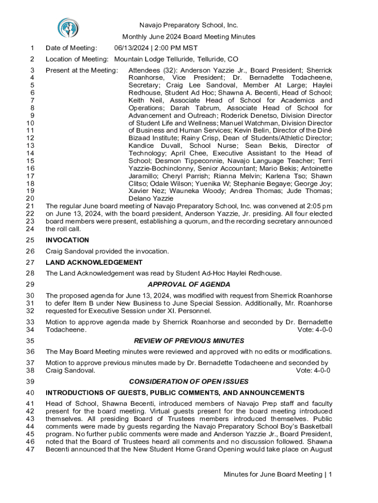 Navajo Preparatory School, Inc. Monthly June 2024 Board Meeting Minutes 1Date of Meeting:06/13/2024 | 2:00 PM MST2Location of Meeting: Mountain Lodge Telluride, Telluride, CO3 4 5 6 7 8 9 10 11 12