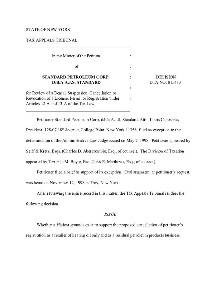 STATE OF NEW YORK TAX APPEALS TRIBUNAL ___ In the Matter of the Petition:of:STANDARD PETROLEUM CORP. D/B/A A.J.S. STANDARD:DECISION DTA NO. 815413: for Review of a Denial, Suspension, Cancellation