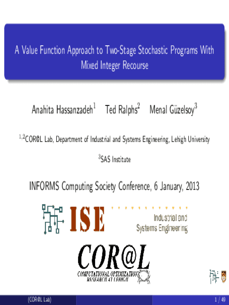 A Value Function Approach to TwoStage Stochastic Programs With Mixed Integer RecourseAnahita Hassanzadeh1 1,2 COR@LTed Ralphs2Menal Guzelsoy3Lab, Department of Industrial and Systems Engineering,