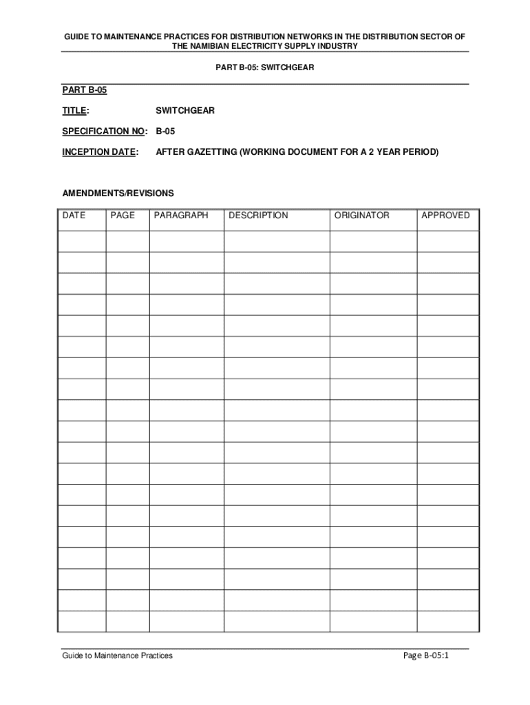 This document provides guidelines for the minimum maintenance requirements for medium voltage (MV) and low voltage (LV) switchgear within the Namibian electricity supply sector, outlining general requirements, safety procedures, and specific maintenance procedures for various types of circuit breakers and related equipment.