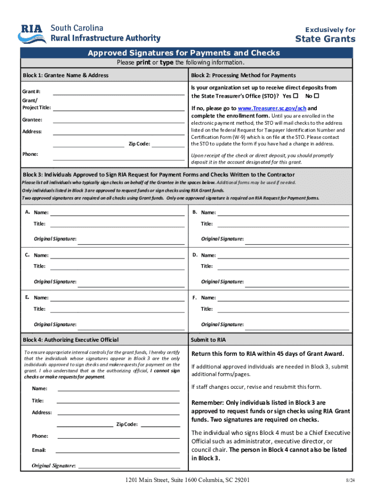 Get the free State Grants Approved Signatures for Payments and Checks - ria sc